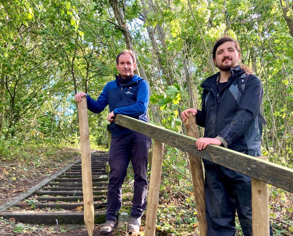 work included replacing handrails on steps in woodland off Legges Lane in Madeley.