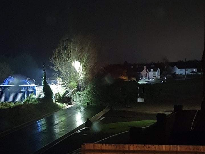 This tree has fallen near the Plough Inn and the darkness makes the trees very difficult to see. Emergency services are on their way to clear the road.